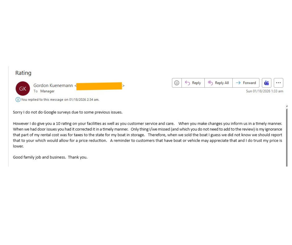 Thank you for sharing your experience with us Richard! We’re delighted to hear that our location, spacious design, and ease of access have helped store your boat. It’s also wonderful to know our team has been able to provide quick and thoughtful support whenever you’ve had questions. We truly value your feedback, and we appreciate your support!