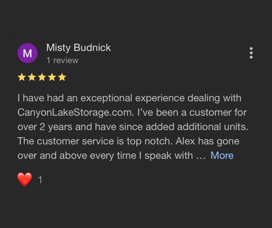 Thank you so much for the kind words! We truly believe that storage is about more than just a space. It’s about people and relationships. Being a family-owned company, we love being able to connect personally with our tenants and make sure everything is going smoothly. Your feedback means the world to us, and we’re so glad you’ve had such a positive experience here at Canyon Lake Storage!