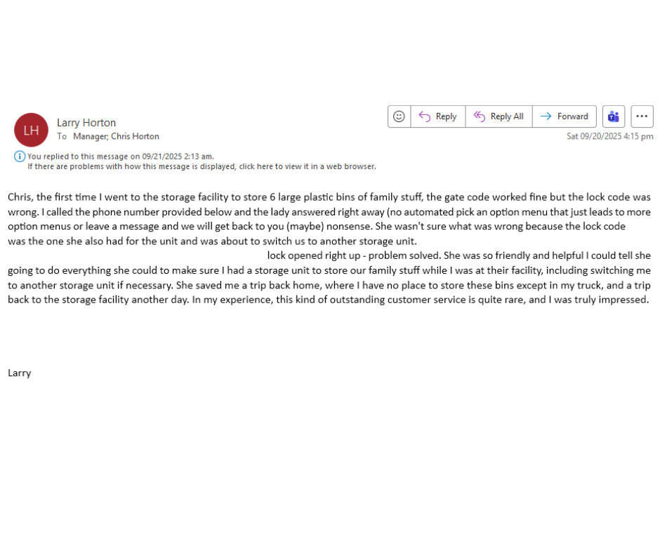 Thank you so much for the kind words, Bob! It really means a lot to our small team here in Canyon Lake. We always do our best to keep things personal, real people, real service, and always just a call or text away.It’s wonderful to hear that you’ve had such a positive experience, and we truly appreciate you being part of the CanyonLakeStorage.com family. Thanks again for your trust and support!